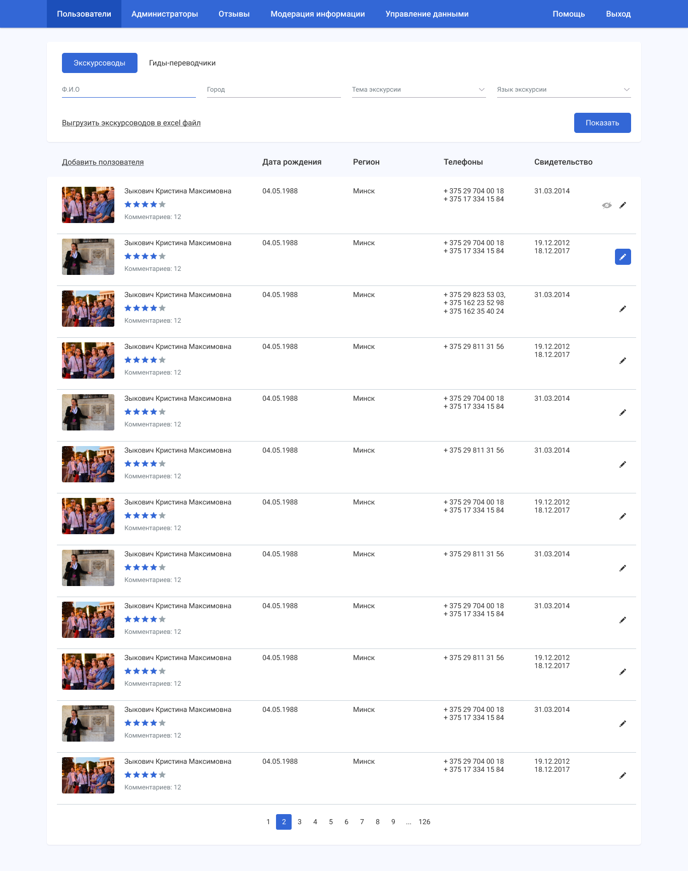 Гибкая админ-панель позволяет иметь полный контроль над сервисом. Модерировать отзывы, информацию о пользователях. Возможность выгрузки пользователей реестра в Exel файл одним нажатием. Ajax поиск.