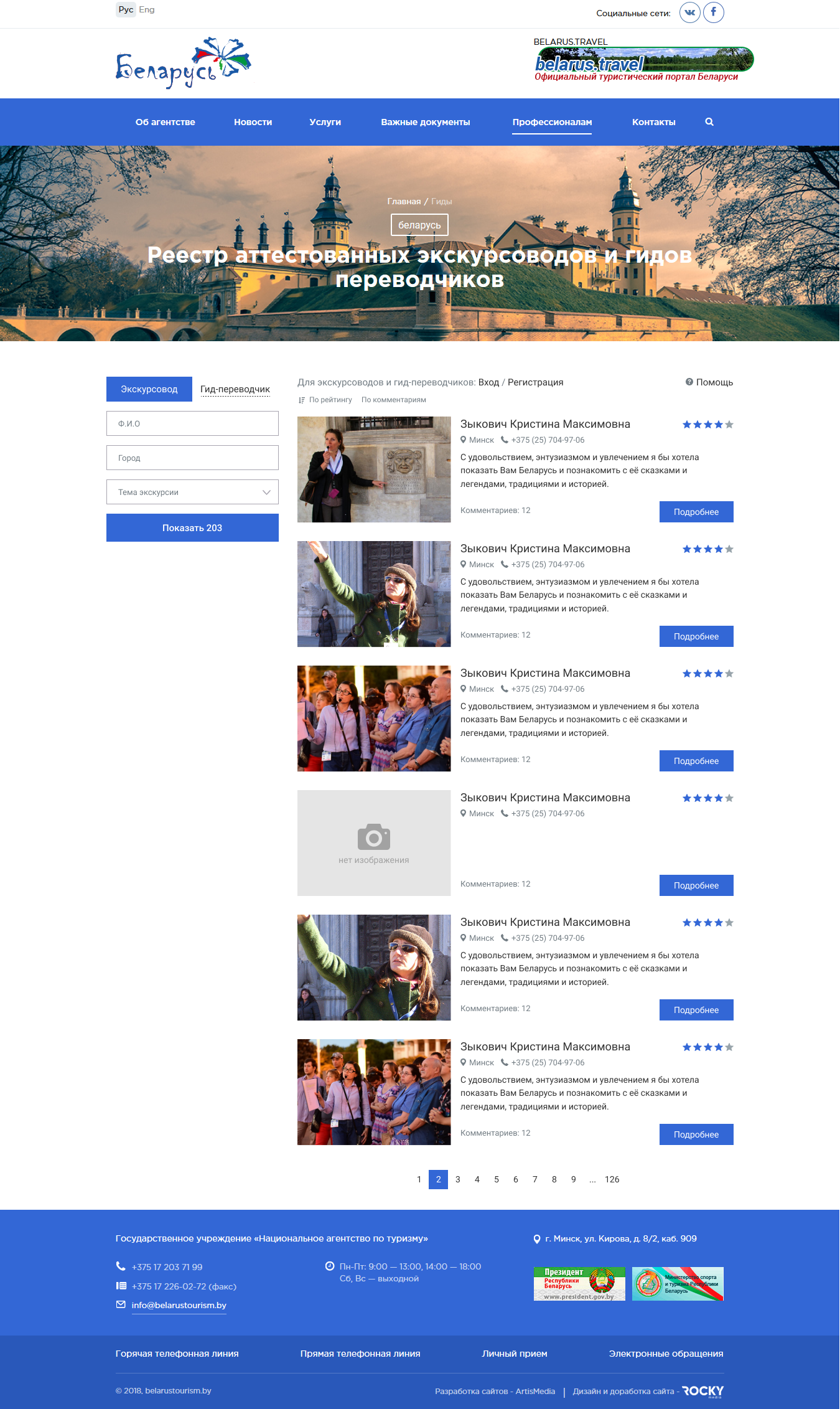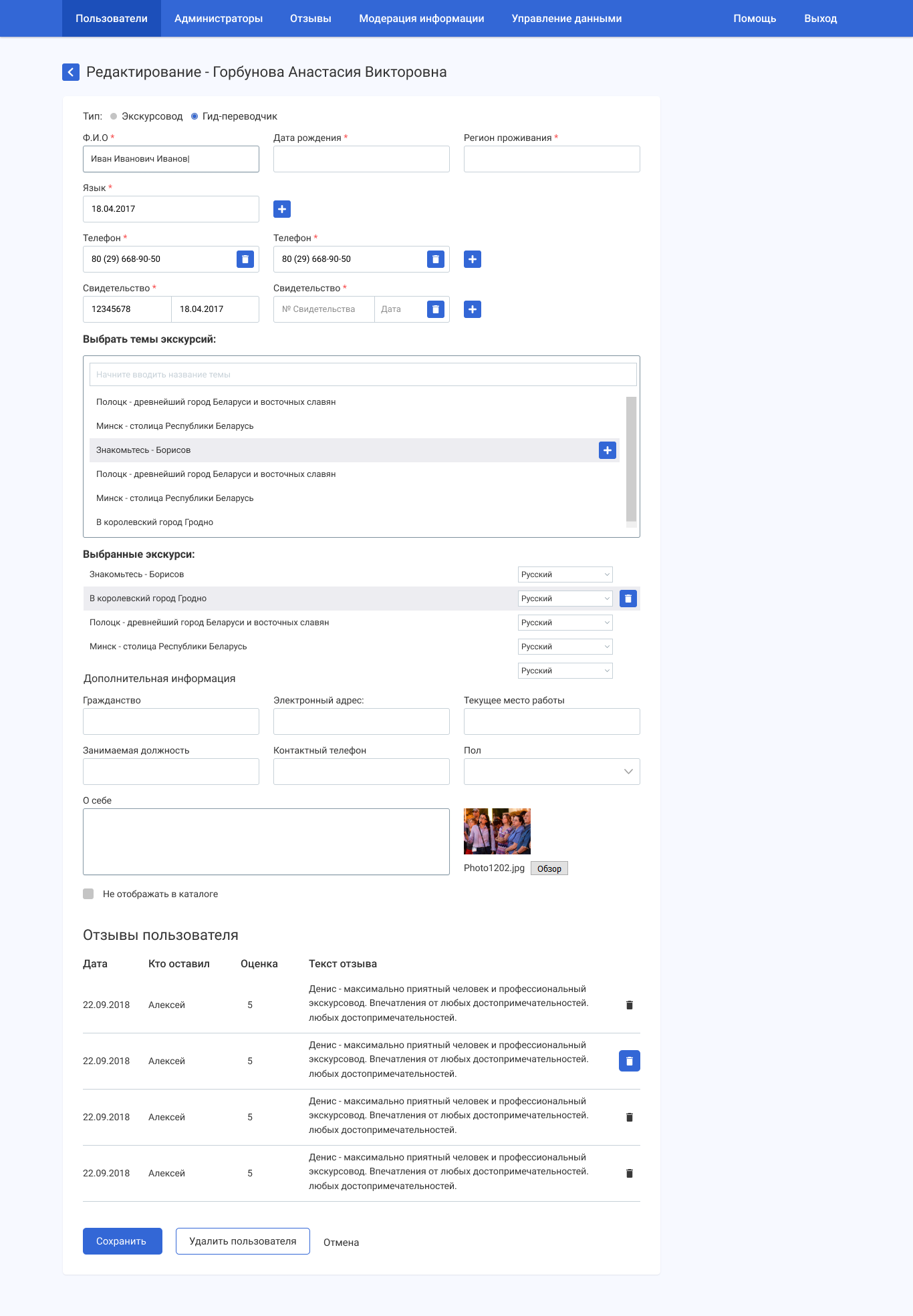 Онлайн реестр позволяет производить поиск по аттестованным экскурсоводам и гидам-переводчикам, выставлять рейтинг, оставлять комментарии. Поиск выполнен по технологии Ajax - авто заполнение данных при вводе информации. Аттестованные гиды-переводчики и экскурсоводы изначально имеются в реестре. Для них есть возможность заполнить более подробно информацию о себе, заполнить контактные данные, загрузить фотографию.